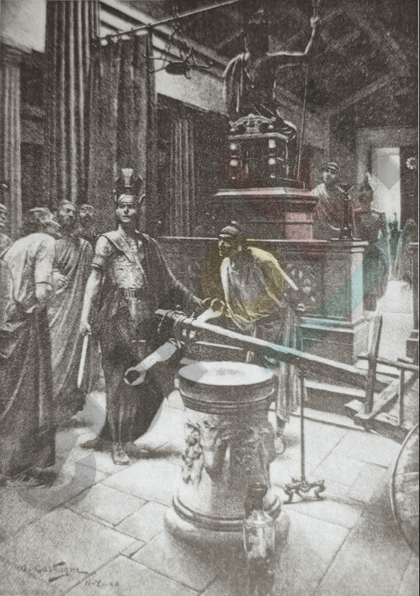1. Полководца зовут Александр Македонский, и он изображён с замахнутым мечом. Полководец намеревается разрубить запутанный узел, так как, согласно преданию, тот, кто развяжет этот узел, станет владыкой Азии.