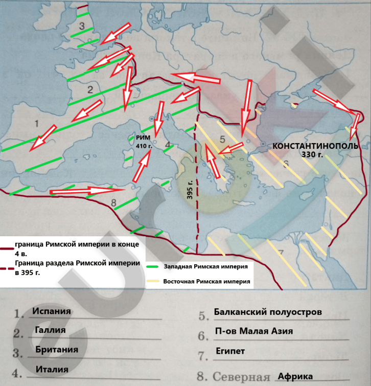 Задание № 94 Заполните контурную карту «Разделение Римской империи и вторжения варваров».