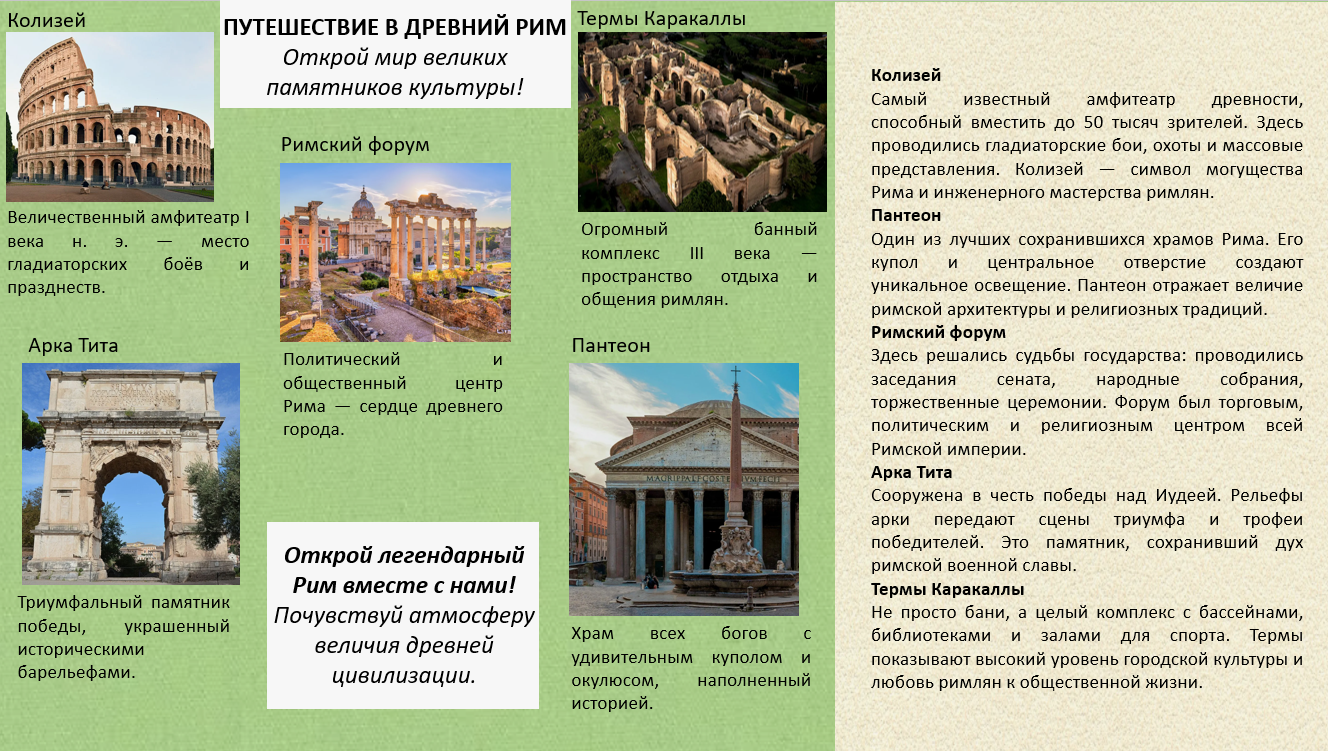 | Создали макет плаката с лозунгом и цветовым решением. | Создан рекламный продукт «Путешествие в Древний Рим», готовый к презентации. |