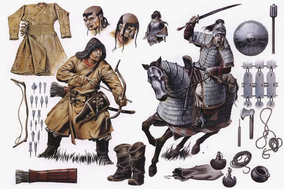 Вооружение монгольского воина — составной (композитный) лук с набором стрел разного назначения, сабля или меч, копьё, иногда топор или булава, аркан; из защитного — ламеллярный или чешуйчатый панцирь, войлочные и кожаные элементы, шлем с наносником, нередко конская броня. Щитом конный лучник пользовался редко — ставка делалась на скорость и дистанцию. Стрелы с гранёными и листовидными наконечниками пробивали кольчуги и щиты; порой применялись «свистуны» для психологического эффекта.