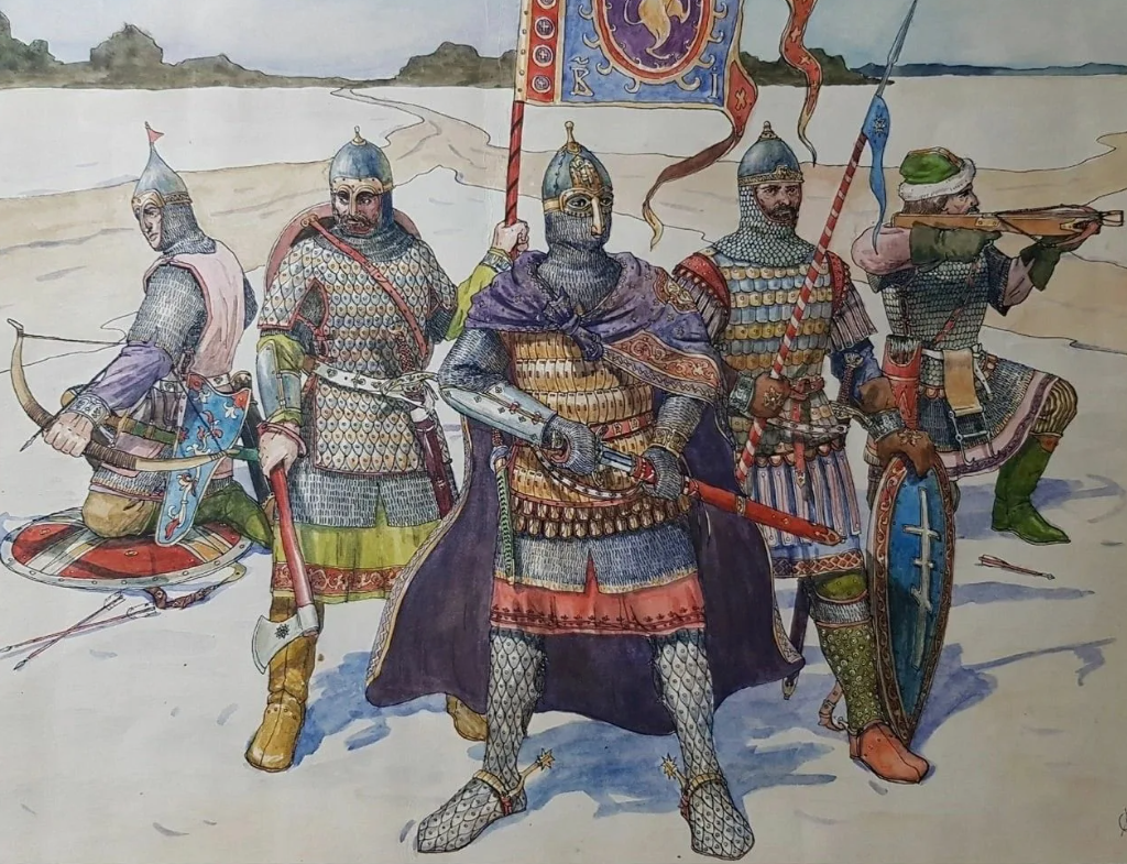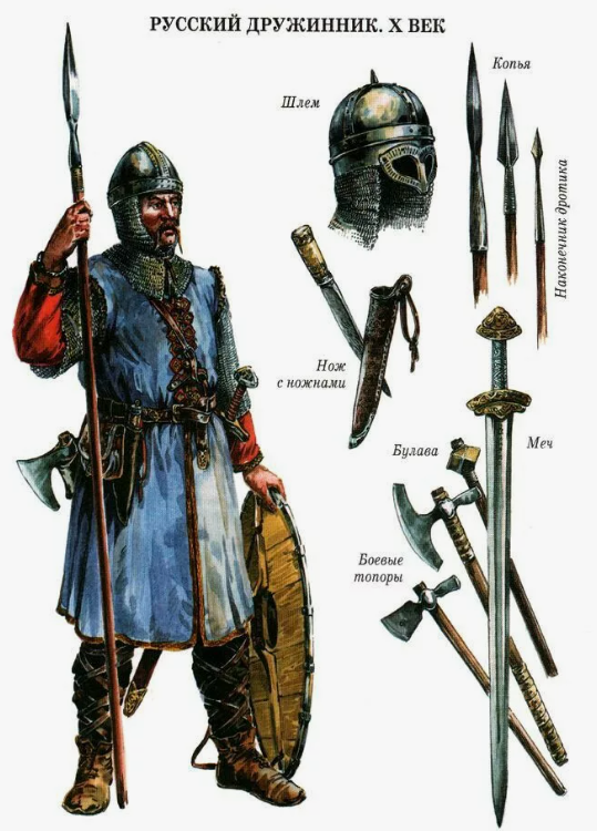 Вооружение русских дружинников включало мечи западноевропейского и местного типов, всё чаще — сабли восточного образца, копья и сулицы, боевые топоры, кистени и булавы; лучники действовали из пеших полков и с коня. Средства защиты — кольчуга с поддоспешником, ламеллярные и чешуйчатые панцири, шлемы-шишаки с бармицей; щиты эволюционировали от круглых к каплевидным и треугольным, удобным для конного боя. К XIV веку росли мастерские по изготовлению доспехов, и в крупных центрах (Москва, Тверь, Новгород) формировался постоянный «служилый» слой, связанный кормлениями и поместными пожалованиями — зачаток будущей поместной конницы.
