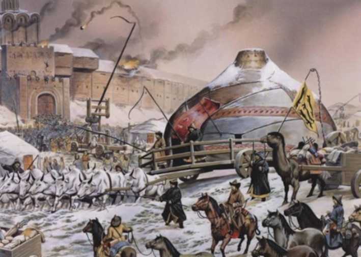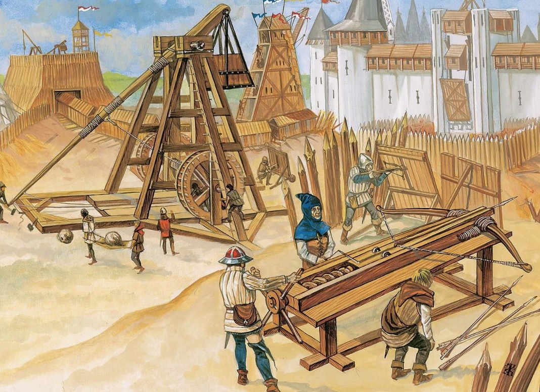 Нашествие 1237–1240 годов застало русские земли в состоянии политической раздробленности, но почти каждый крупный центр попытался обороняться, опираясь на деревянно-земляные укрепления и городскую общину. Классическая русская крепость этого времени — вал с рвом, высокий частокол из острогов, башни над воротами и «детинец» как внутренняя цитадель. Защитники строили «городни» и помосты для лучников, держали запас камней, брёвен, смолы. Против них монголы применяли инженерную осадную технику — «пороки» (метательные машины), тараны, подкопы, подвозили лестницы, прикрывались подвижными щитами и системно изматывали гарнизоны обстрелом и дневными штурмами.