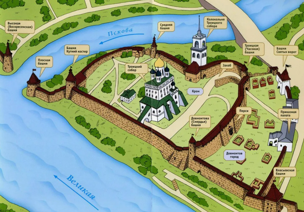 Не меньшим, чем полевые победы, стало градостроительное наследие. У южной стены Крома (псковского Кремля) возник «Довмонтов город» — пояс дворов и церквей, укреплявших цитадель и служивших административным и сакральным предместьем. При Довмонте закладывались храмы-памятники победам, росли казённые амбары и склады, пополнялась городская казна. Псков укреплялся как «город-полк»: административная сеть, военная дисциплина и религиозная символика работали на одно — стойкость общины.