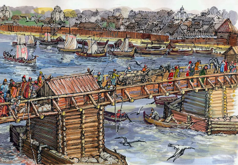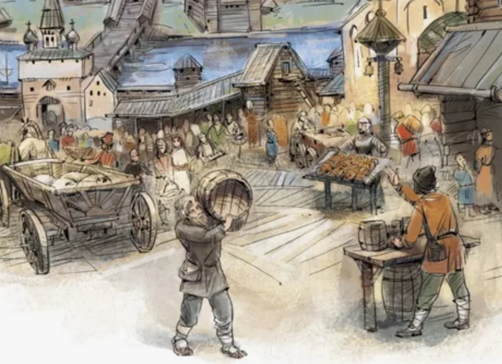 Ключ к пониманию Новгорода — его двусоставность. На Софийской стороне возвышается детинец с каменной Софией, рядом архиепископский двор, казна и вечевая площадь; на Торговой стороне — гостиный двор, ряды кожевников, кузнецов, ювелиров и пекарей. По мосту через Волхов непрерывно движутся подводы: везут соль, воск, меха, лён, рыбу, мёд. День здесь расписан торговыми звонами и кличами приказчиков: весы скрипят, меновщики считают гривны и куну, писцы заносят сделки на бересту.