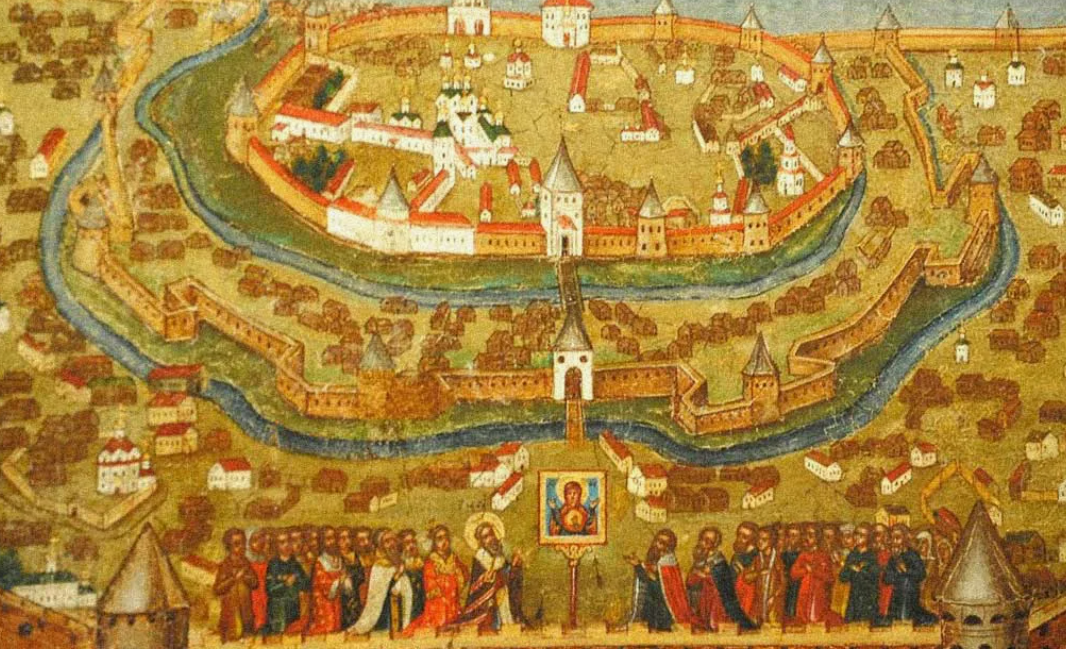 Мы поднимаемся на стены детинца. С башен виден план города: улицы-«концы», «улицы» и «улицы-волоки», по которым в распутицу настилают брёвна. Внутри — дворы бояр и купцов с клетями, тёплыми избами и «чёрными» сенями без трубы, где дым выходит через волоковое окно. На углу — небольшая каменная церковь с фресками, её строили артелями византийских и новгородских мастеров; колоколом звонят к службе и к вечу. Вечевое собрание решает дела мира и войны, приглашает и изгоняет посадников, заключает договоры — поэтому город живёт не только торговлей, но и правом.