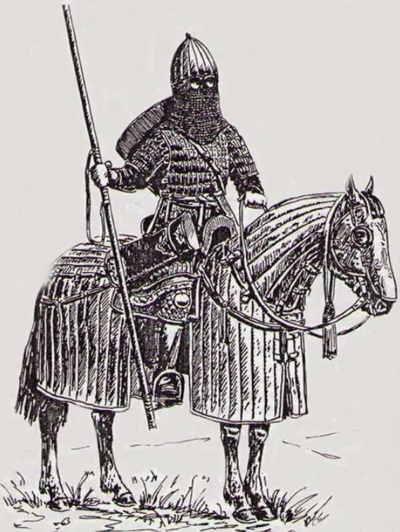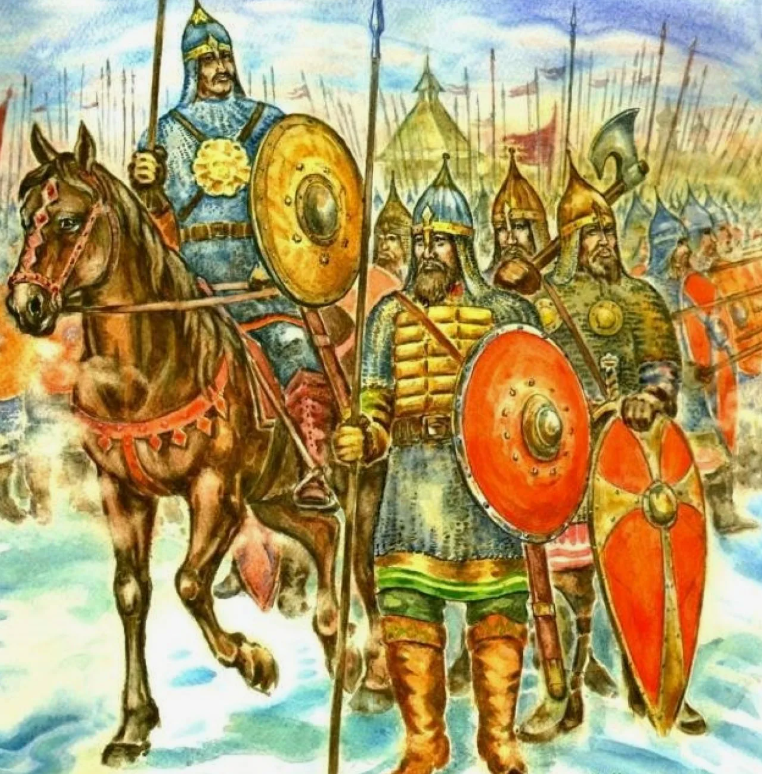 Снаряжение конницы включало удила, стремена, седло с высокой лукой, защищающие наездника при ударе копьём. Боевой конь ценился почти наравне с мечом; богатые дружинники имели запасных коней и парадные наборы сбруи. В осадах применялись таран, лестницы, засеки, реже — метательные машины; городские укрепления отвечали частоколом, стенами, башнями и боевыми площадками для лучников. Тактика строилась на сочетании конного удара и пешего строя: щитовое «поле» с копьями, поддержка стрелков, добивание клинком; на реке и в ладейных походах войско действовало десантом, прикрываясь щитами на бортах.