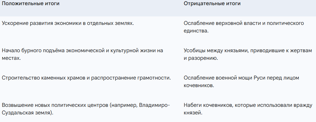 4. Заполните в тетради таблицу «Последствия раздробленности Руси». Укажите в ней положительные и отрицательные итоги раздробленности.