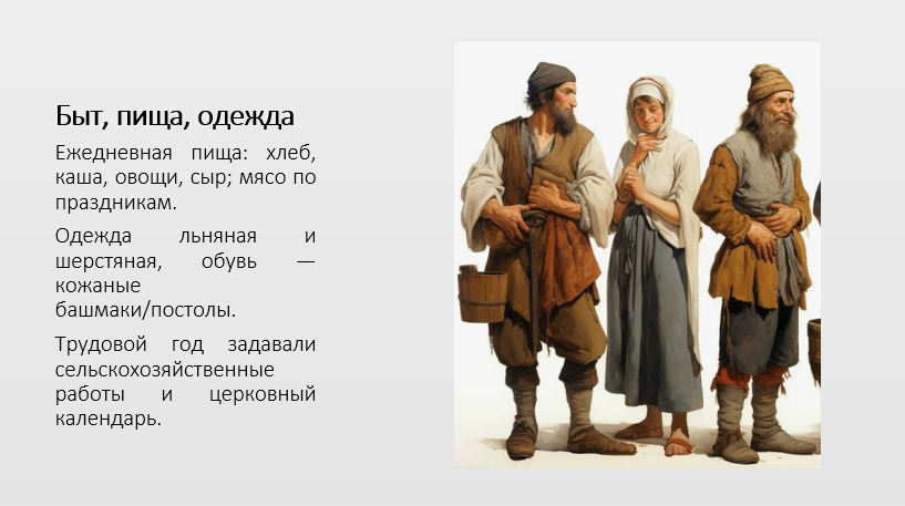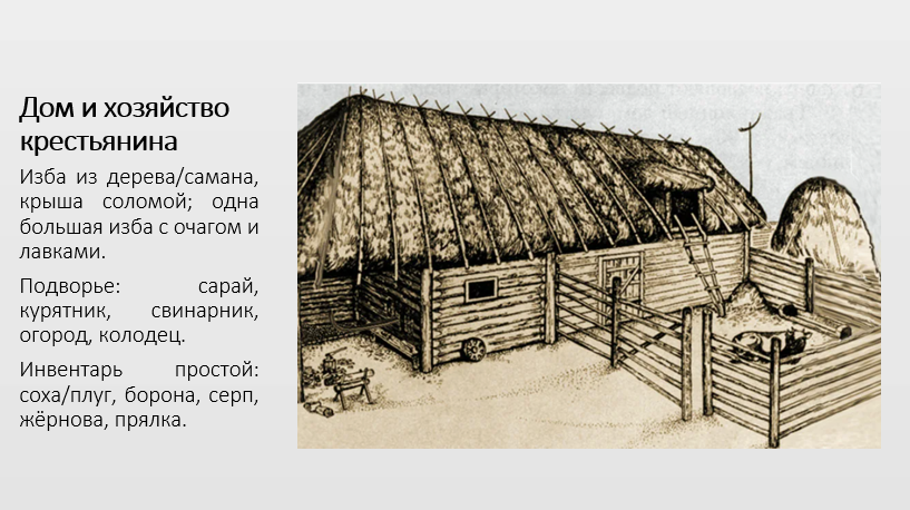 • Имущество: Крестьянин, в отличие от раба, часто имел собственное хозяйство, инвентарь и право пользоваться частью земли, хотя и с обязанностью нести повинности (оброк, барщина). Раб не имел ничего.