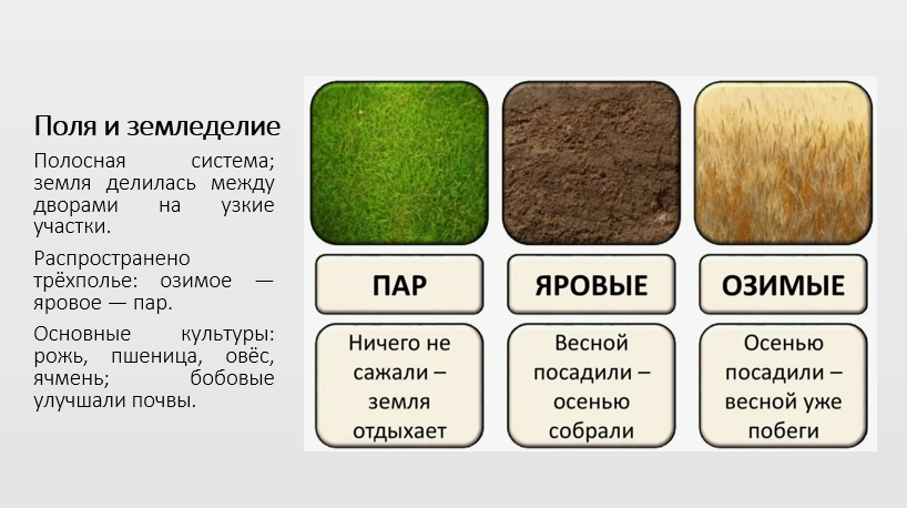 Земледелие велось по трёхпольной системе: одну часть засеивали озимыми, другую — яровыми, а третья отдыхала под паром. Урожай зависел от погоды, поэтому неурожаи и голод случались часто. Рабочие дни крестьянина определялись церковным календарём — посты, праздники и ярмарки чередовались с тяжёлым трудом на земле.