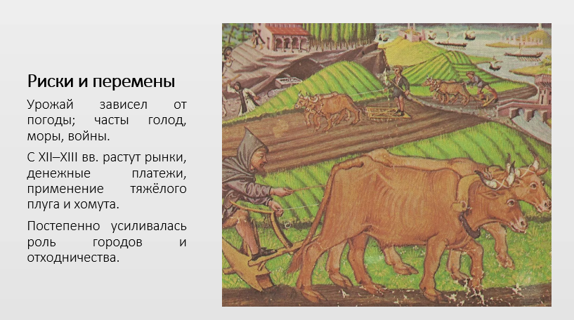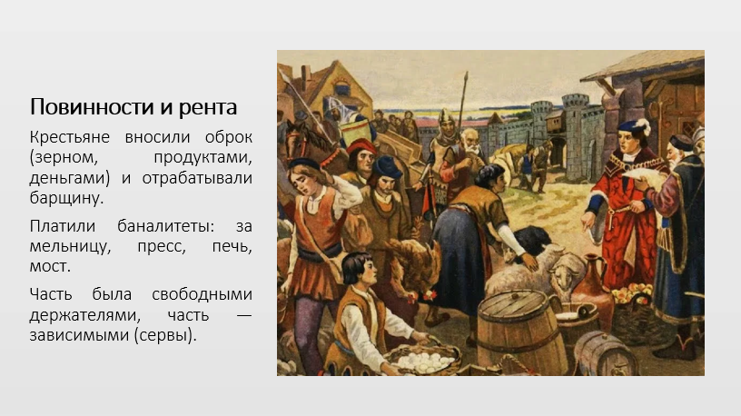 • Крестьяне: Жили в деревнях, занимались сельским хозяйством (трёхпольем), были зависимы от феодалов и несли повинности (оброк, барщина).