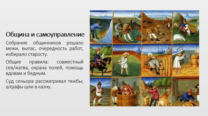 Деревенская жизнь подчинялась общинным правилам. Все решения принимались на сходе, выбирался староста, решались споры и определялись сроки сева и жатвы. Община помогала бедным, вдовам и сиротам. Несмотря на зависимость от сеньора, крестьяне ощущали единство и поддержку соседей.
