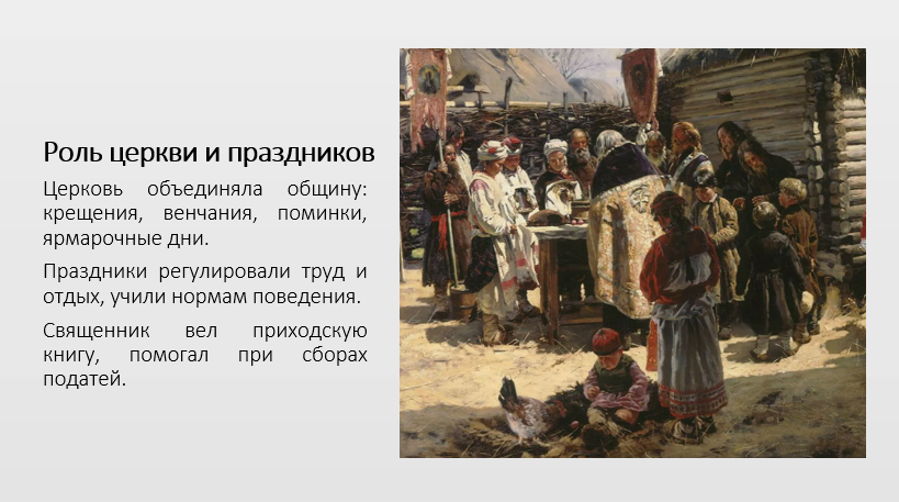 Церковь занимала особое место: она регулировала поведение, отмечала праздники, учила основам веры и морали. Крестьяне приходили в храм на службу, крестины и венчания, что объединяло их духовно.