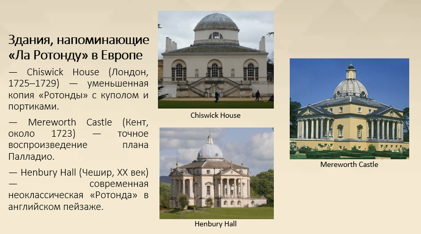 4. Используя ресурсы Интернета, подготовьте презентацию о влиянии Палладио на архитектуру последующих веков. Найдите здания, которые напоминают Ла Ротонду.