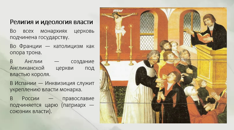 Испания Сильный абсолютизм, опирающийся на огромные колониальные богатства и Католическую церковь (Контрреформация). Чрезмерная централизация и религиозная нетерпимость (Инквизиция).