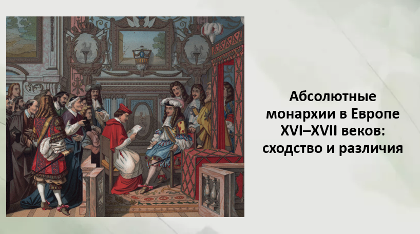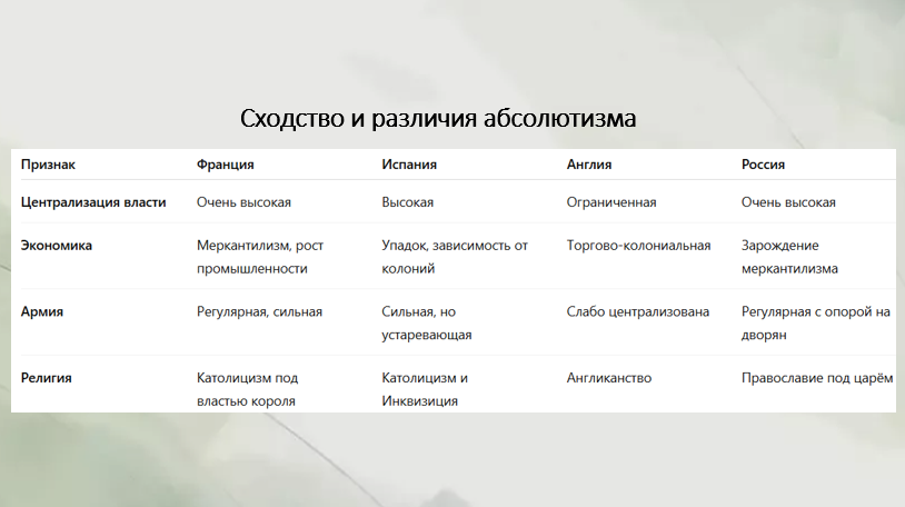 3. Абсолютные монархии в Европе XVI—XVII вв.: сходство и различия. С помощью Интернета или дополнительной литературы проведите сравнительный анализ абсолютизма в европейских странах (бюрократический аппарат, участие государства в экономической жизни страны, армия, религия). Подготовьте презентацию. Сделайте выводы.