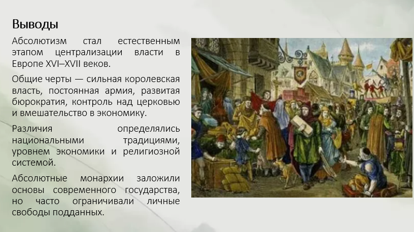 • Потребность в порядке: После религиозных войн и социальных конфликтов XVI–XVII веков (например, в период Контрреформации) общество почувствовало потребность в сильной центральной власти, способной обеспечить мир и порядок.