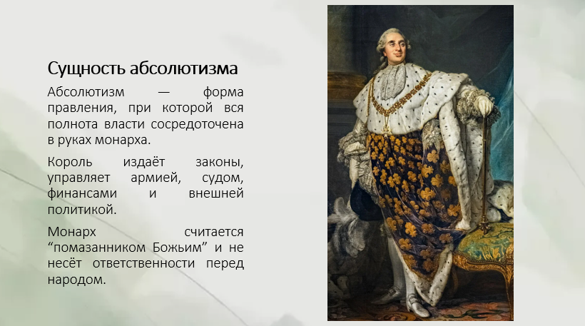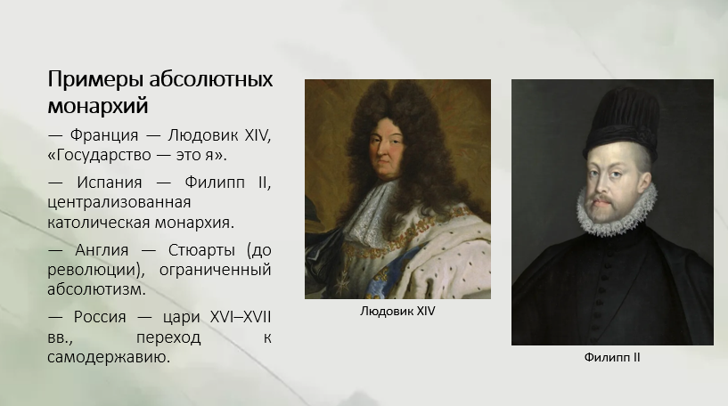 Франция Классический абсолютизм (при Людовике XIV): полная ликвидация роли Генеральных штатов, неограниченная власть короля, опирающаяся на сильную бюрократию и постоянную армию.