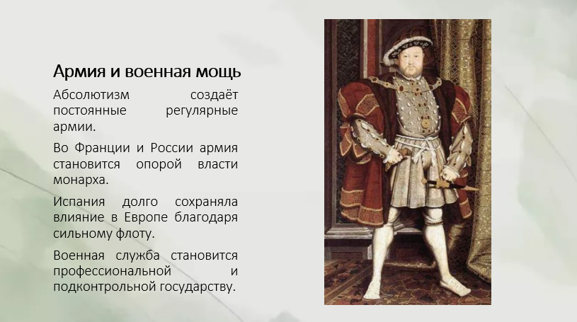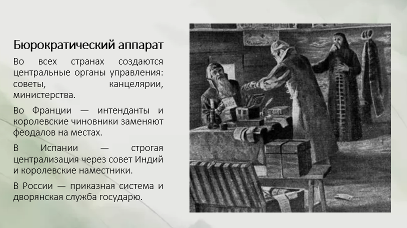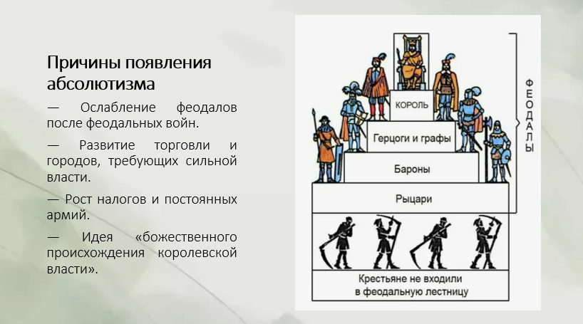 • Поддержка дворянства и буржуазии: Дворянство нуждалось в монаршей власти для подавления крестьянских выступлений, а буржуазия — для создания единого национального рынка и защиты от феодальной раздробленности.
