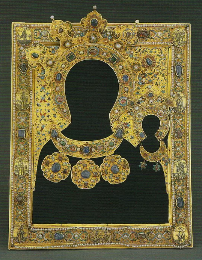 Золотой оклад Евангелия XVI в. . Оклады (внешнее оформление) Евангелий XVI века, например, золотой оклад Одигитрии, являются подлинными шедеврами. Они выполнены с применением техник басмы, скани, зерни, украшены жемчугом и драгоценными камнями, что отражает безграничное почитание святыни. Это демонстрирует расцвет ювелирного мастерства, когда оклады превращались в самостоятельные произведения искусства.