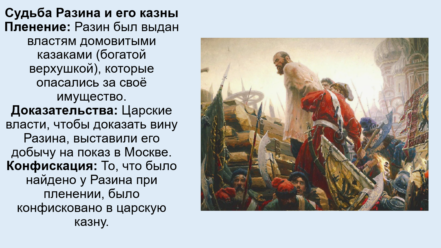 2. Прецедент: Власти стремились устроить показательную и жестокую расправу над Разиным, чтобы запугать крестьян и казаков и предотвратить новые выступления.