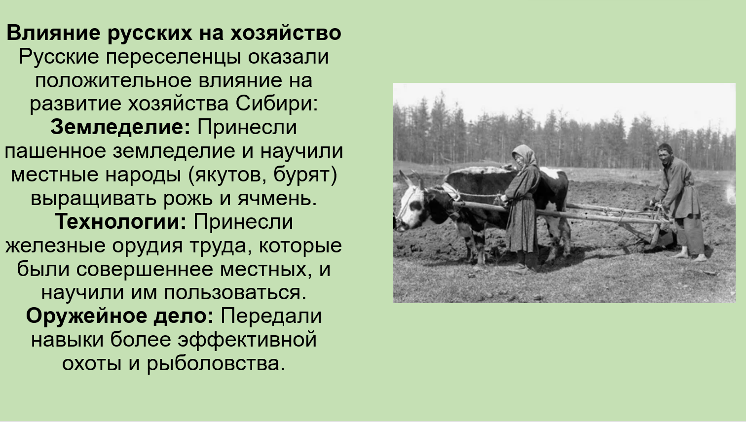 Добавить текст Озвучить Вернуть оригиналРазвитие хозяйства: Под влиянием русских переселенцев местные народы заимствовали более совершенные орудия труда и способы ведения хозяйства (пашенное земледелие, новые культуры).