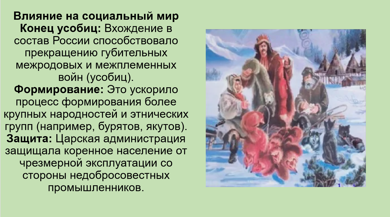 Добавить текст Озвучить Вернуть оригиналЗащита: Русское правительство, в отличие от европейских колонизаторов, защищало коренное население от чрезмерной эксплуатации со стороны промышленников и не допустило массового истребления или работорговли.