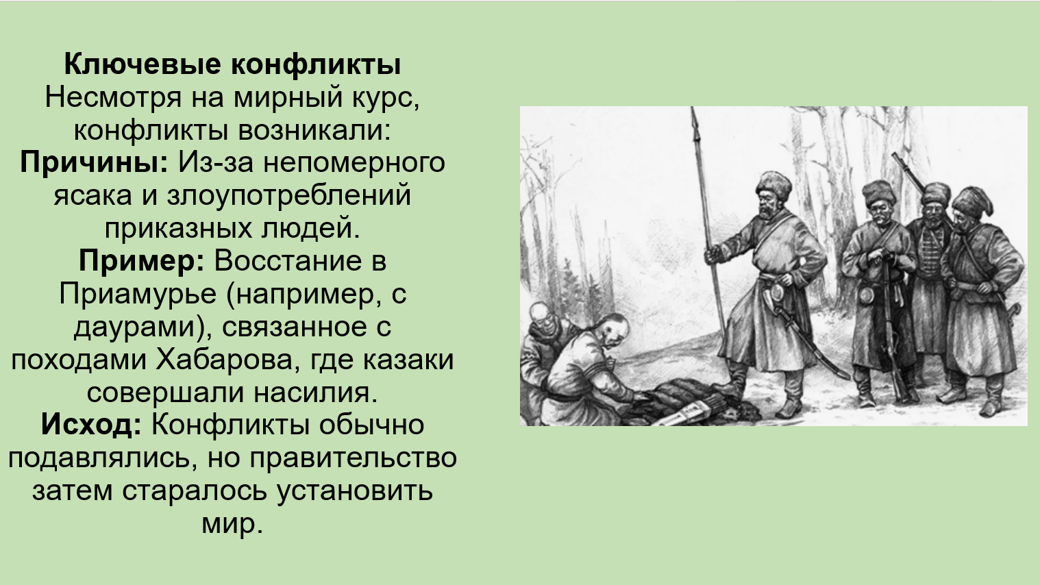Добавить текст Озвучить Вернуть оригиналЗащита: Правительство стремилось прекратить губительные межродовые усобицы и защищало нерусское население от чрезмерной эксплуатации со стороны казаков и промышленников.