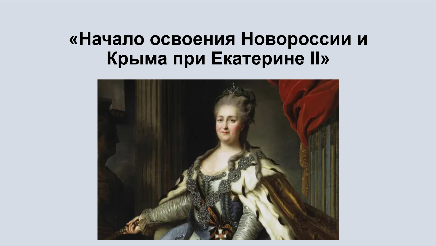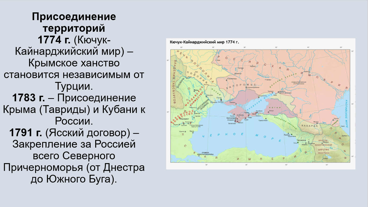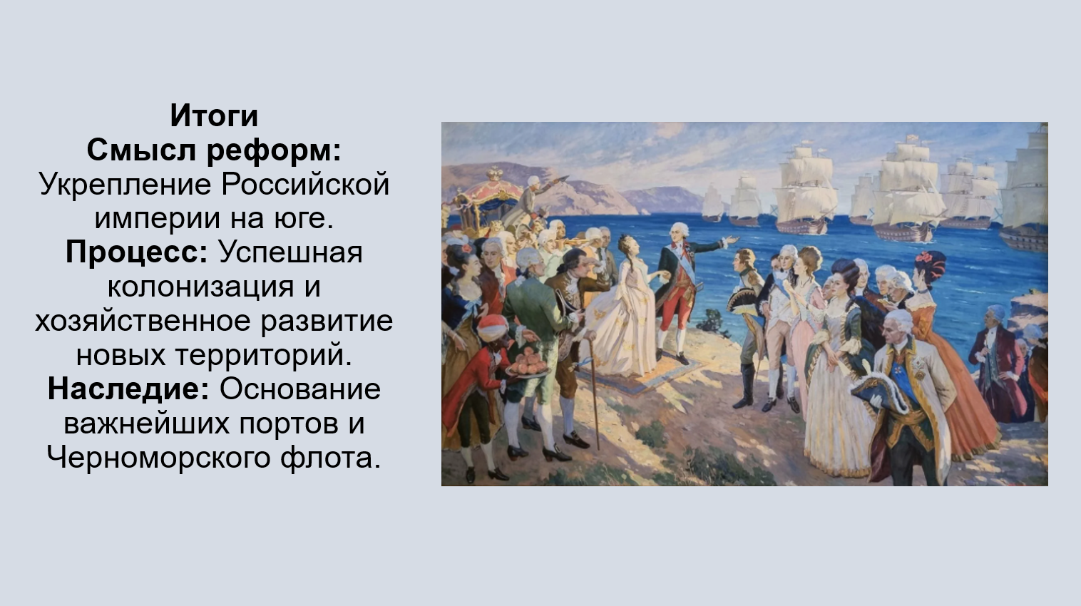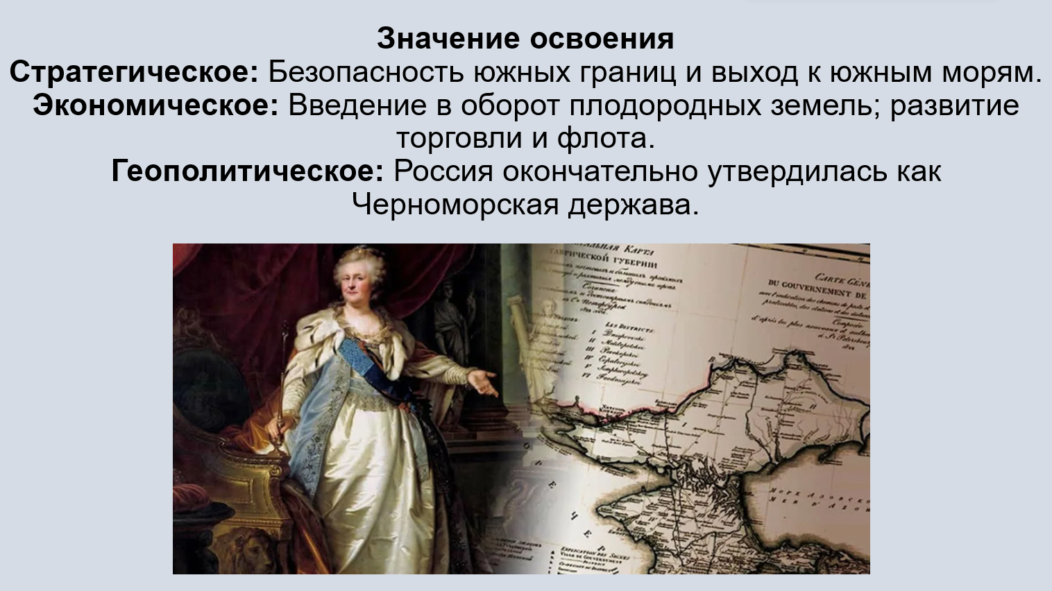 Добавить текст Вернуть оригиналВоенно-стратегическое утверждение: Присоединение Крыма и освоение Новороссии ликвидировали угрозу татарских набегов, обеспечили безопасность южных границ и позволили создать мощный Черноморский флот с главной базой в Севастополе.