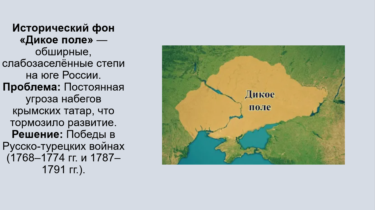 Добавить текст Вернуть оригиналПобед в Русско-турецких войнах: Освоение стало возможным после отодвигания границ России на юг, ослабления Османской империи и установления протектората над Крымским ханством, что обезопасило эти земли от постоянных набегов крымских татар.