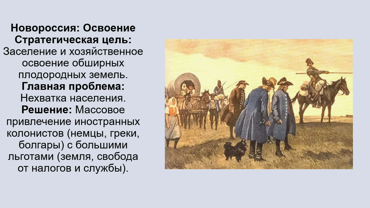 Добавить текст Вернуть оригиналПроблема крепостного права: В условиях господства крепостного права массовое перемещение крестьян в Новороссию было невозможно.