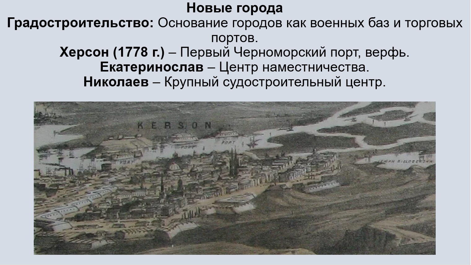 Добавить текст Вернуть оригиналХерсон (заложен в 1778 г.): Первый черноморский военный и коммерческий порт; адмиралтейская верфь; литейный завод; «третья столица» (по замыслу Потёмкина, после Москвы и Петербурга).
