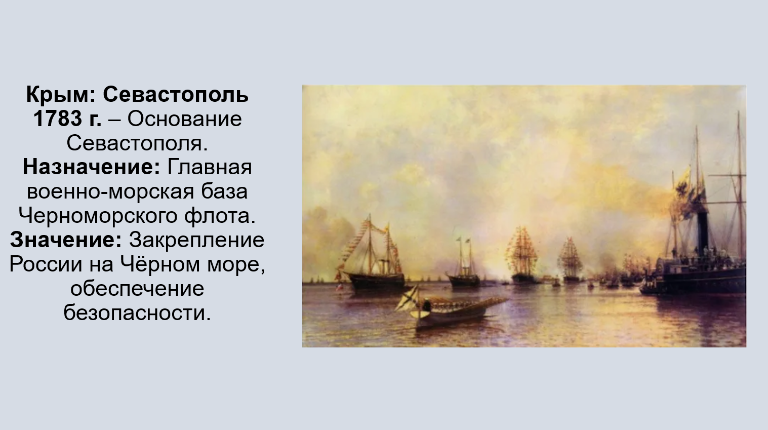 Добавить текст Вернуть оригиналСевастополь (основан в 1783 г.): Назван «священным городом» и «императорским городом»; главная военно-морская база России на Чёрном море.