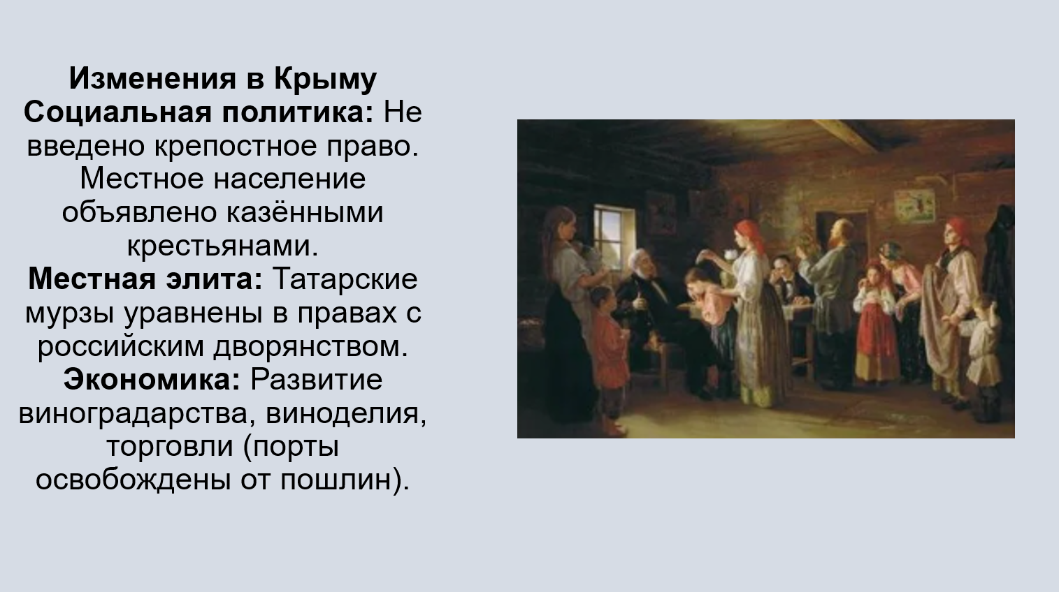 Добавить текст Вернуть оригиналОтмена крепостного права: В Крым не была введена система крепостного права (местное население было объявлено казёнными крестьянами).