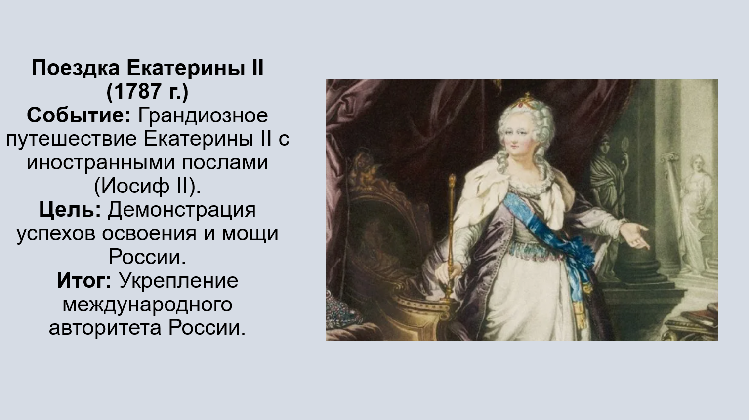 Добавить текст Вернуть оригинал7. Расскажите о поездке Екатерины II в Новороссию и Крым.