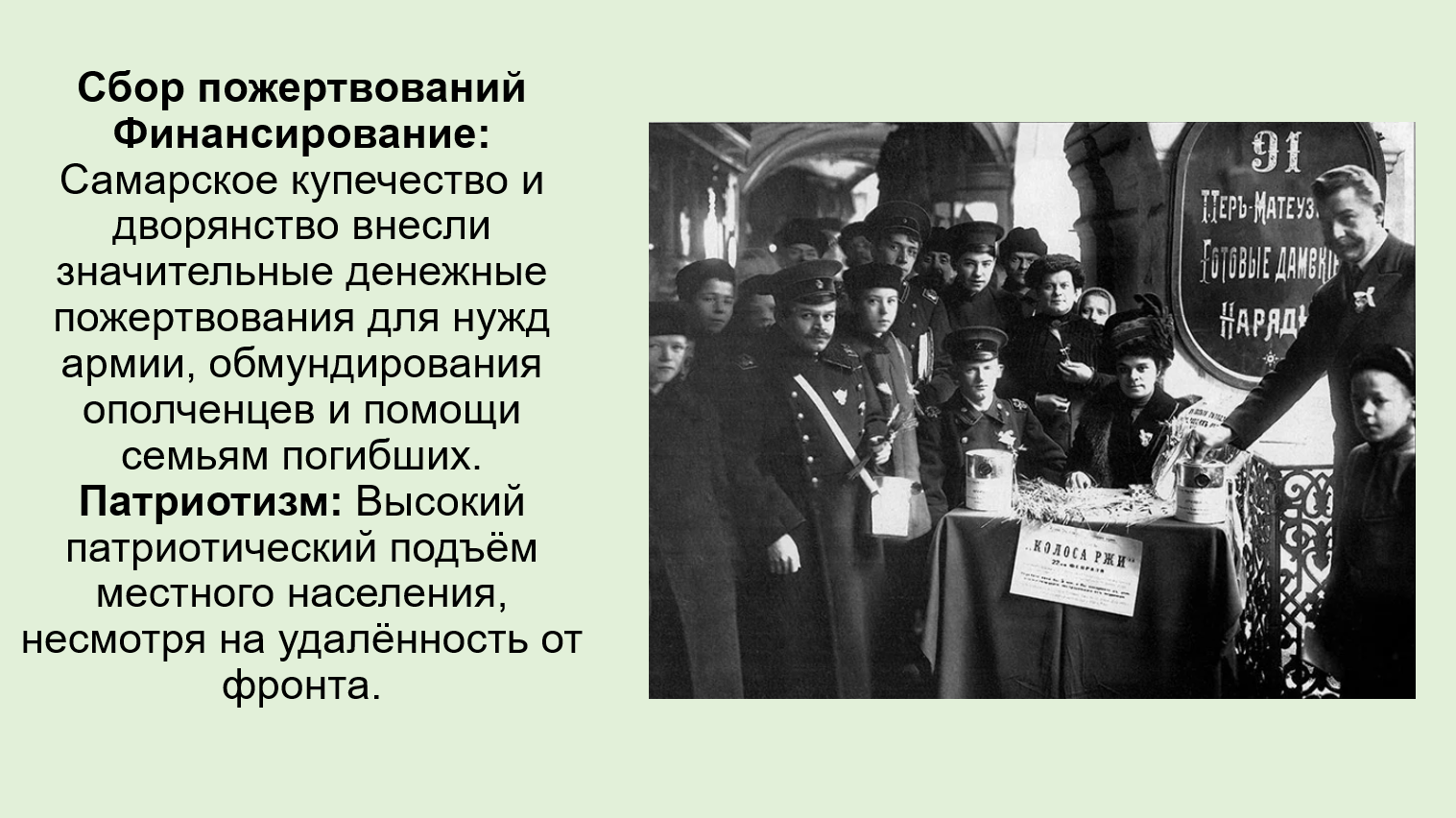 Война 1812 года была Отечественной и народной, и Самарский край активно участвовал во всеобщем патриотическом подъёме. Местные дворяне участвовали в наборе рекрутов и формировании Симбирского ополчения. Кроме того, купцы и мещане Самары делали значительные денежные пожертвования на нужды армии, раненых и семей погибших, демонстрируя высокий уровень национального единства.