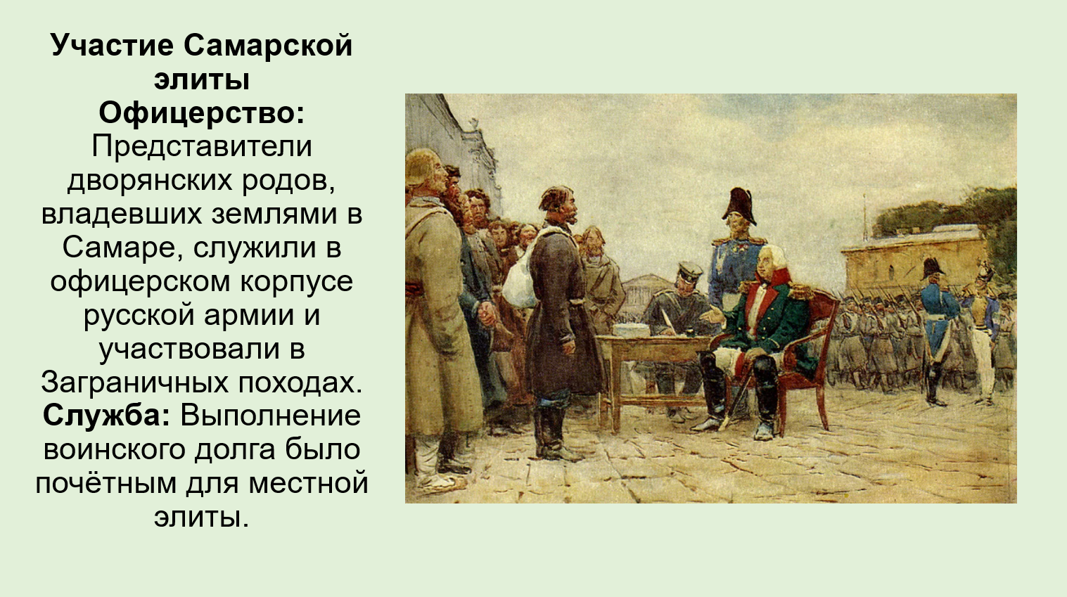 Многие представители дворянских родов, владевших землями в Самарском уезде, служили офицерами в действующей армии и участвовали как в обороне 1812 года, так и в Заграничных походах 1813–1814 гг. Их личный вклад и архивные документы о сборе средств и ополченцах являются главной мемориальной связью Самары с той великой войной.