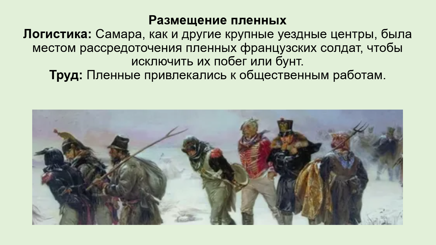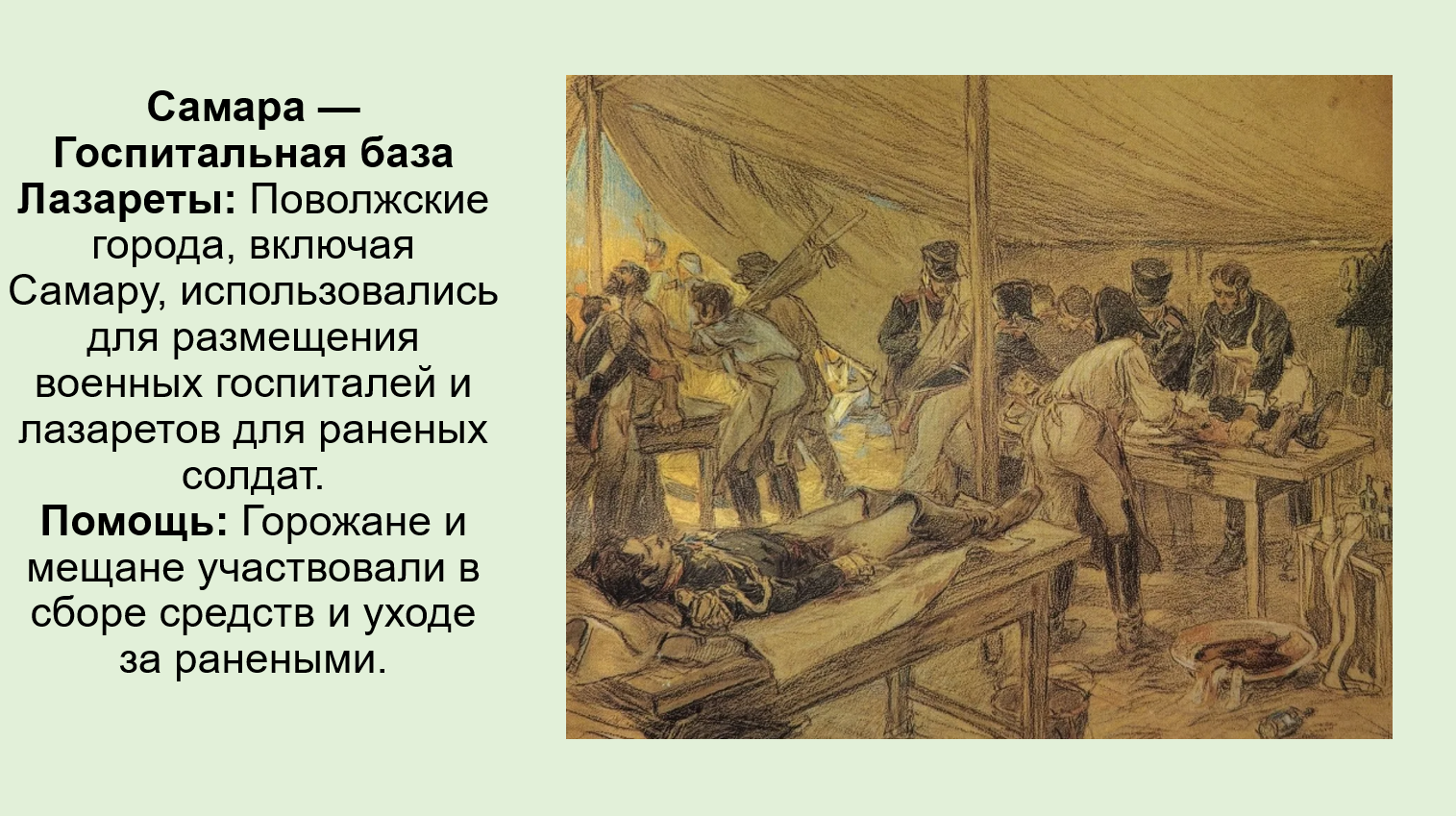 Поскольку западные регионы были разорены, Поволжье служило базой для лечения и размещения людей. В Самаре и соседних городах создавались госпитальные пункты для приёма и лечения раненых русских солдат. Также сюда направлялись пленные французские солдаты для размещения и использования на общественных работах.