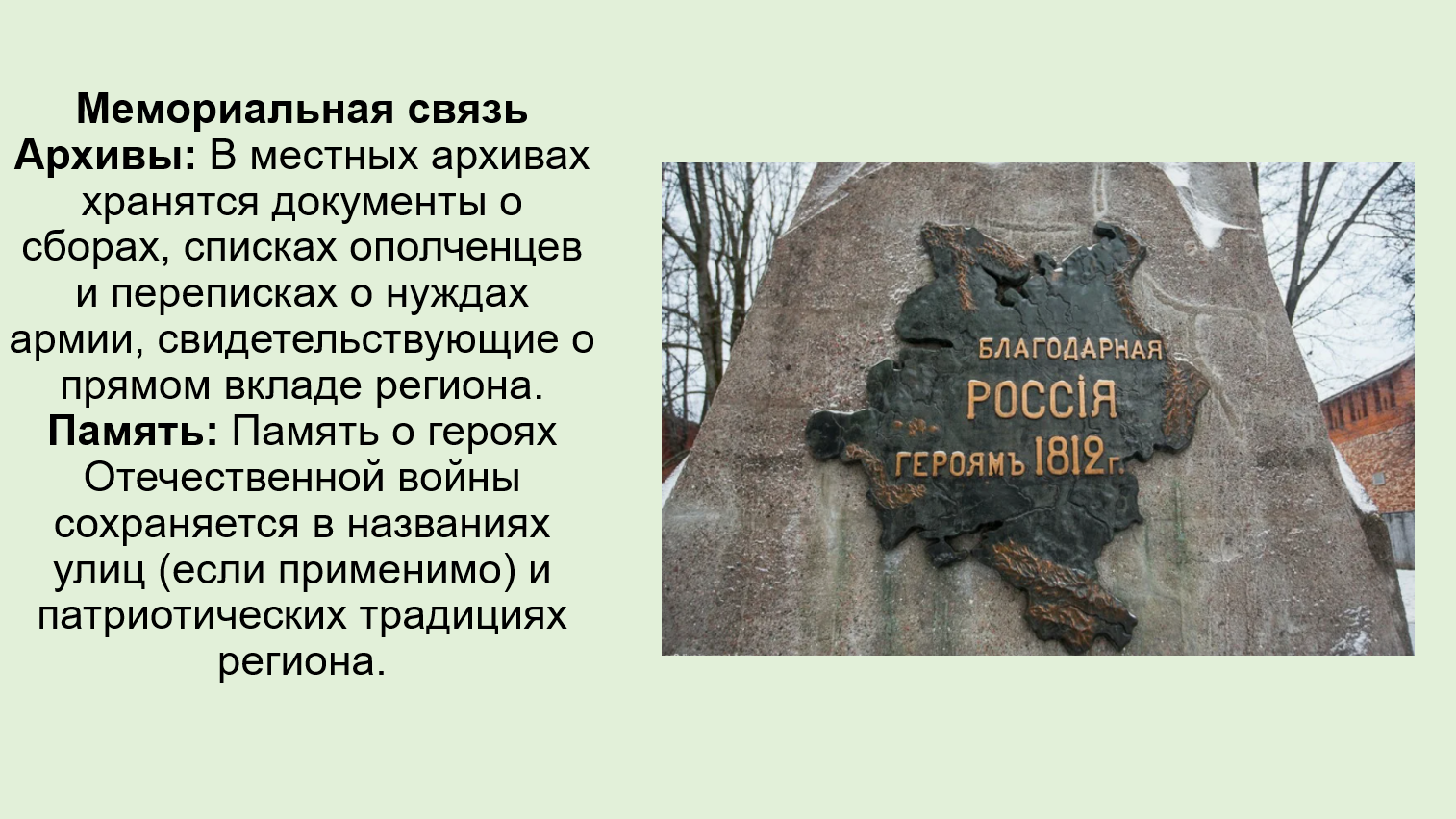 6. Узнайте, есть ли в вашем городе/регионе места, связанные с событиями или жизнью участников Отечественной войны 1812 г., Заграничных походов русской армии 1813–1814 гг., и подготовьте сообщение о них с презентацией.