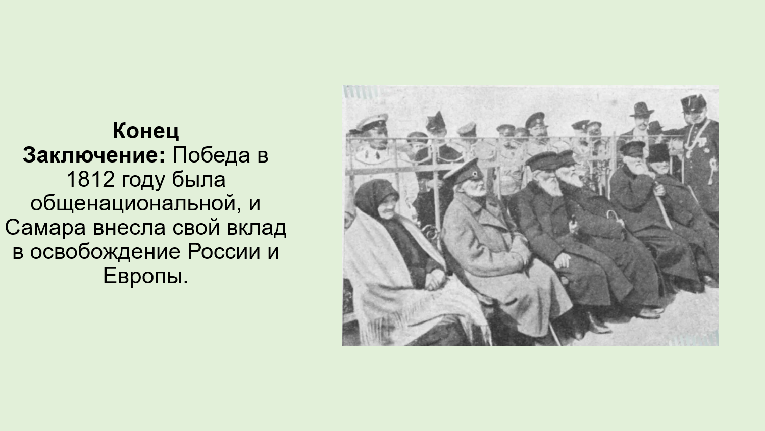 В заключение хочу подчеркнуть: победа в 1812 году была достигнута не только на поле боя. Она стала возможной благодаря неутомимой работе тыла и всеобщему патриотизму. Самарский край, обеспечив армию продовольствием и людскими ресурсами, внёс критически важный вклад в изгнание Наполеона и освобождение Европы.