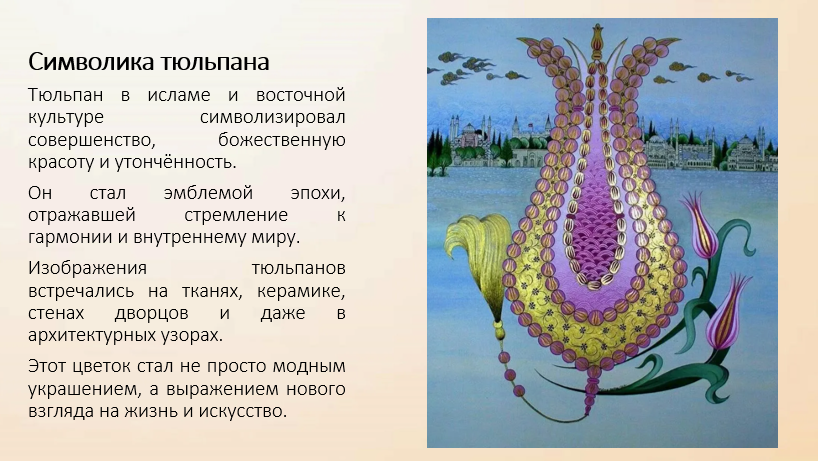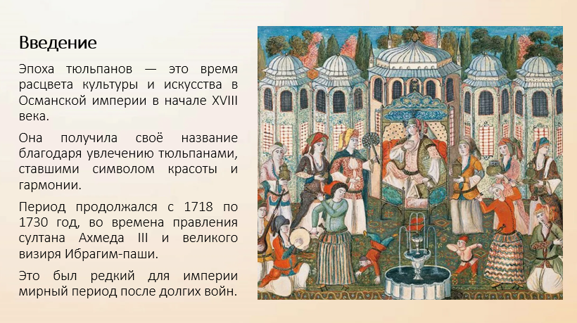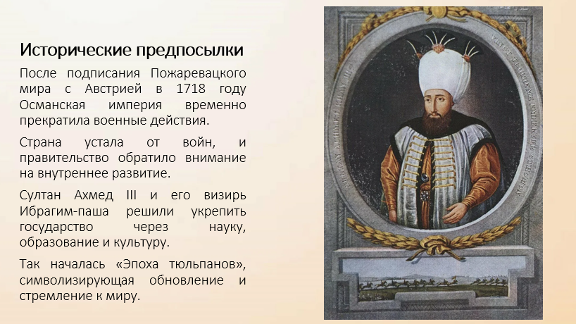 Эпоха тюльпанов (1718–1730 гг.) — особый период в истории Османской империи, получивший название из-за необычайной популярности тюльпанов как символа красоты, изящества и новой, более мирной жизни. В это время у власти находился султан Ахмед III, а главным визирем был Ибрагим-паша. После долгих войн Османская империя переживала мирное время и обращала внимание на внутреннее развитие, культуру и искусство.