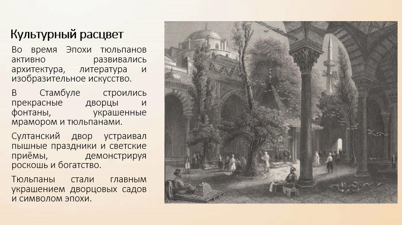 Эпоха тюльпанов стала временем расцвета архитектуры и изящных искусств. В Константинополе строились новые дворцы, фонтаны и сады, украшенные тюльпанами. Империя начала перенимать элементы европейской культуры — появились первые типографии, печатались книги, развивались поэзия и живопись. Высшая знать устраивала роскошные праздники и торжества в садах, где тюльпан был главным украшением.