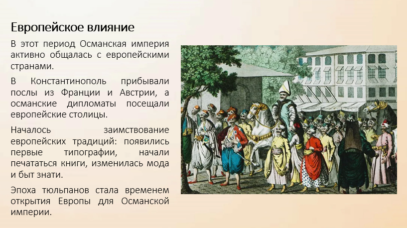 Особое значение имели международные связи. В этот период усилились контакты с Францией и другими странами Европы. Послы Османской империи посещали европейские дворы, знакомились с новыми идеями и технологиями. Началось постепенное проникновение европейских веяний в моду, искусство и даже быт османской знати.