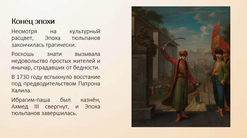 Однако не все в обществе одобряли перемены. Простые горожане и воины (янычары) считали, что правители живут в роскоши, забывая о нуждах народа. Это недовольство вылилось в восстание Патрона Халила в 1730 году, после которого Эпоха тюльпанов закончилась. Тем не менее, она оставила заметный след в истории — стала символом культурного обновления, первой попытки османского общества приблизиться к европейской модели развития.