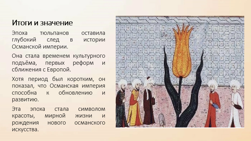 Эпоха тюльпанов показала, что Османская империя способна не только воевать, но и создавать прекрасное. Она стала временем гармонии искусства и мирной жизни, символом перехода от средневекового образа государства к более открытому и утончённому обществу.