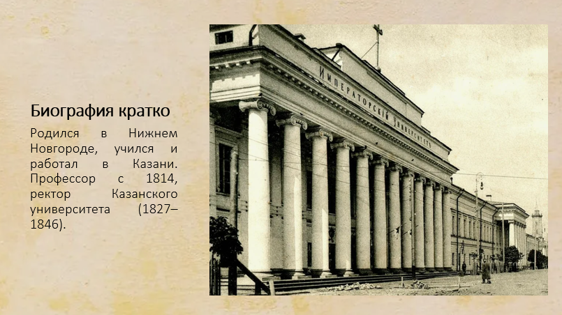 Добавить текст Вернуть оригиналУчёный развил методы аналитической геометрии и тригонометрии, занимался алгеброй (численные методы решения уравнений), математическим анализом, астрономией и геодезией (организовал в Казани наблюдения, продвигал точные измерения земной поверхности). Как ректор Казанского университета (1827–1846) модернизировал преподавание, поддерживал исследования, создал условия для работы обсерватории и кабинетов.
