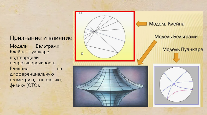 Добавить текст Вернуть оригиналЗначение открытий Лобачевского огромно. Его геометрия стала фундаментом для развития дифференциальной геометрии и топологии; во второй половине XIX века её непротиворечивость была подтверждена математическими моделями (Бельтрами, Клейном, Пуанкаре). В XX веке идеи гиперболической геометрии оказались востребованы в физике, в частности в общей теории относительности, где пространство-время описывается римановой геометрией неплоской кривизны. Тем самым Лобачевский продемонстрировал, что математика может содержать альтернативные, но строго доказуемые картины пространства.