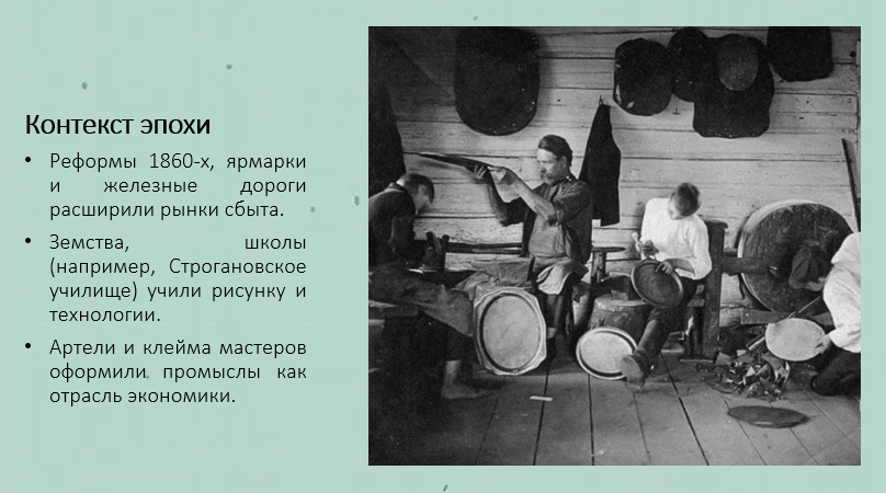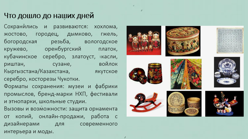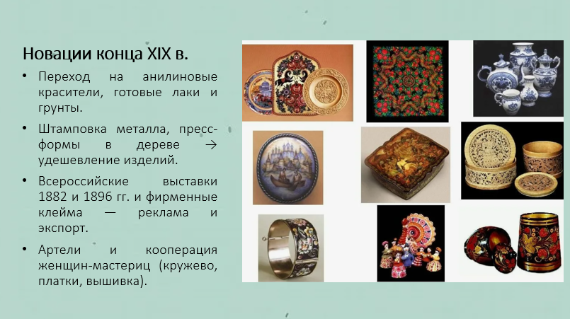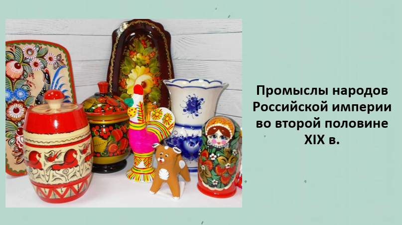 Добавить текст Вернуть оригинал6. Создайте электронную презентацию «Промыслы народов Российской империи во второй половине XIX в.». Отразите в ней своеобразие народных промыслов, а также акцентируйте внимание, какие из промыслов дошли до наших дней.