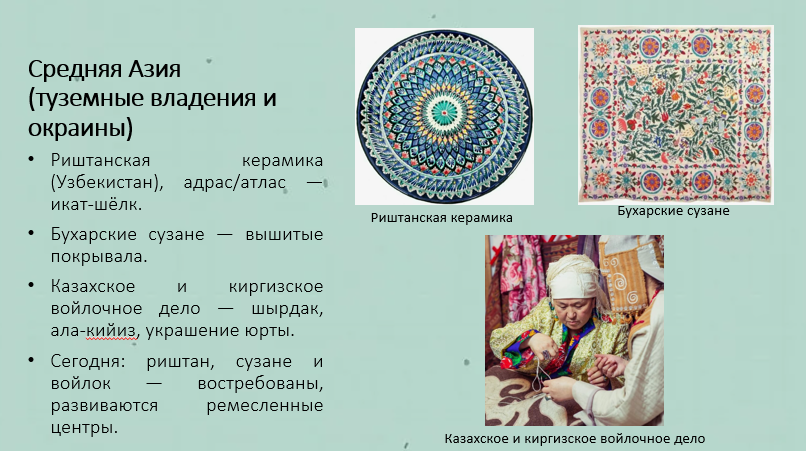Добавить текст Вернуть оригинал2. Какие промыслы были развиты в Средней Азии? Выясните, какие изделия среднеазиатских мастеров ценятся и в наше время.