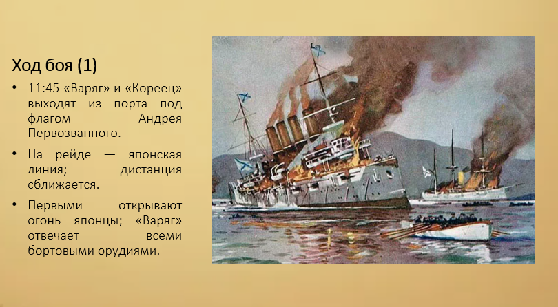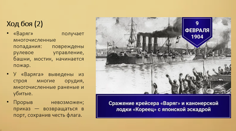 Добавить текст Вернуть оригинал2) подвиг экипажа крейсера «Варяг» (27 января 1904 г.)