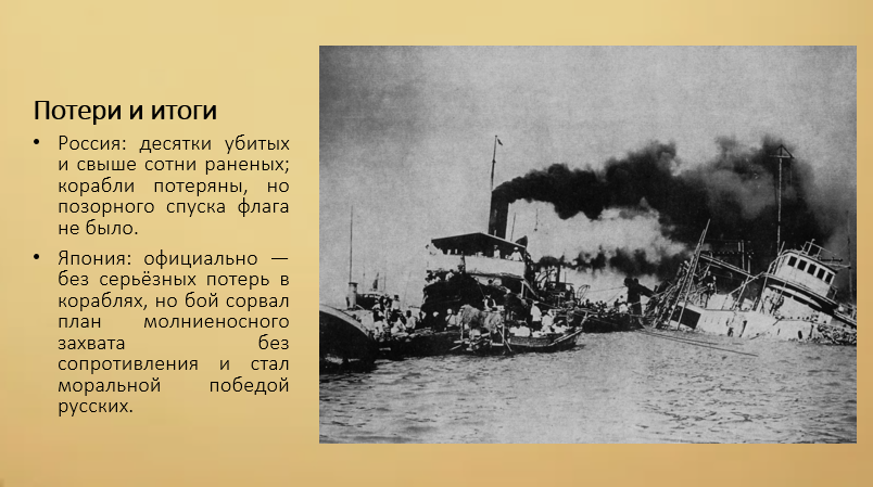 Добавить текст Вернуть оригиналДля России: Главным итогом было падение Порт-Артура после героической обороны, стоившей обеим сторонам огромных потерь (японцы потеряли свыше 100 тыс. человек, русские – до 30 тыс. погибших и раненых).